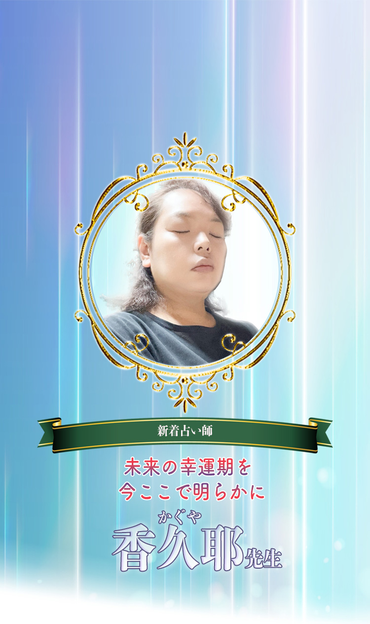 霊感・霊視とタロットを組み合わせ、運命の流れと具体的な時期を丁寧に読み解く“香久耶(かぐや)“先生。高次のエネルギーを感じ取りながら、ただ結果を伝えるだけでなく、その未来を引き寄せるために今できることまで具体的にアドバイスします。人生の大きな転機など、曖昧になりがちな未来を明確に示していただけます。