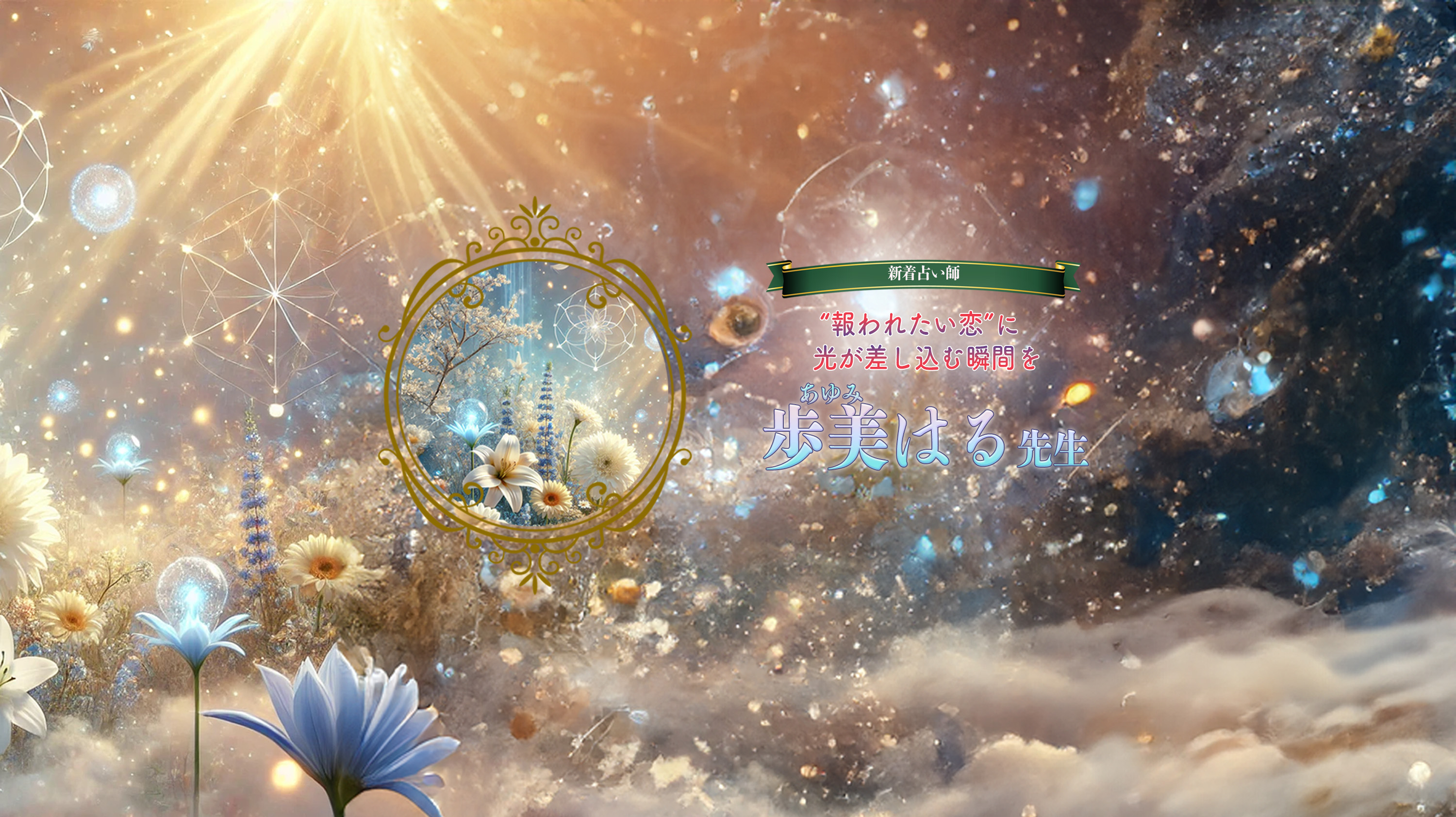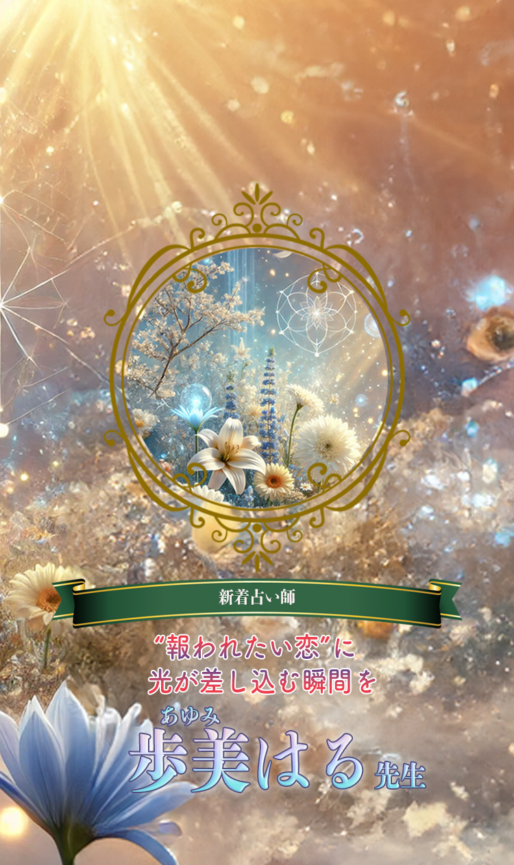 守護霊対話・オーラリーディング・過去世リーディングを通じて、恋愛に迷う人々の魂の声を丁寧に読み解くスピリチュアル鑑定師"歩美(あゆみ)はる"先生。片想い・復縁・曖昧な関係・報われない恋など、複雑な想いにも静かに寄り添いながら、お相手の本心やふたりの魂の縁、今後の展開を深く見通してくれます。無限の可能性を信じる気持ちにそっと寄り添いながら、本来のご相談者様らしい愛し方へと優しく背中を押してくれることでしょう。