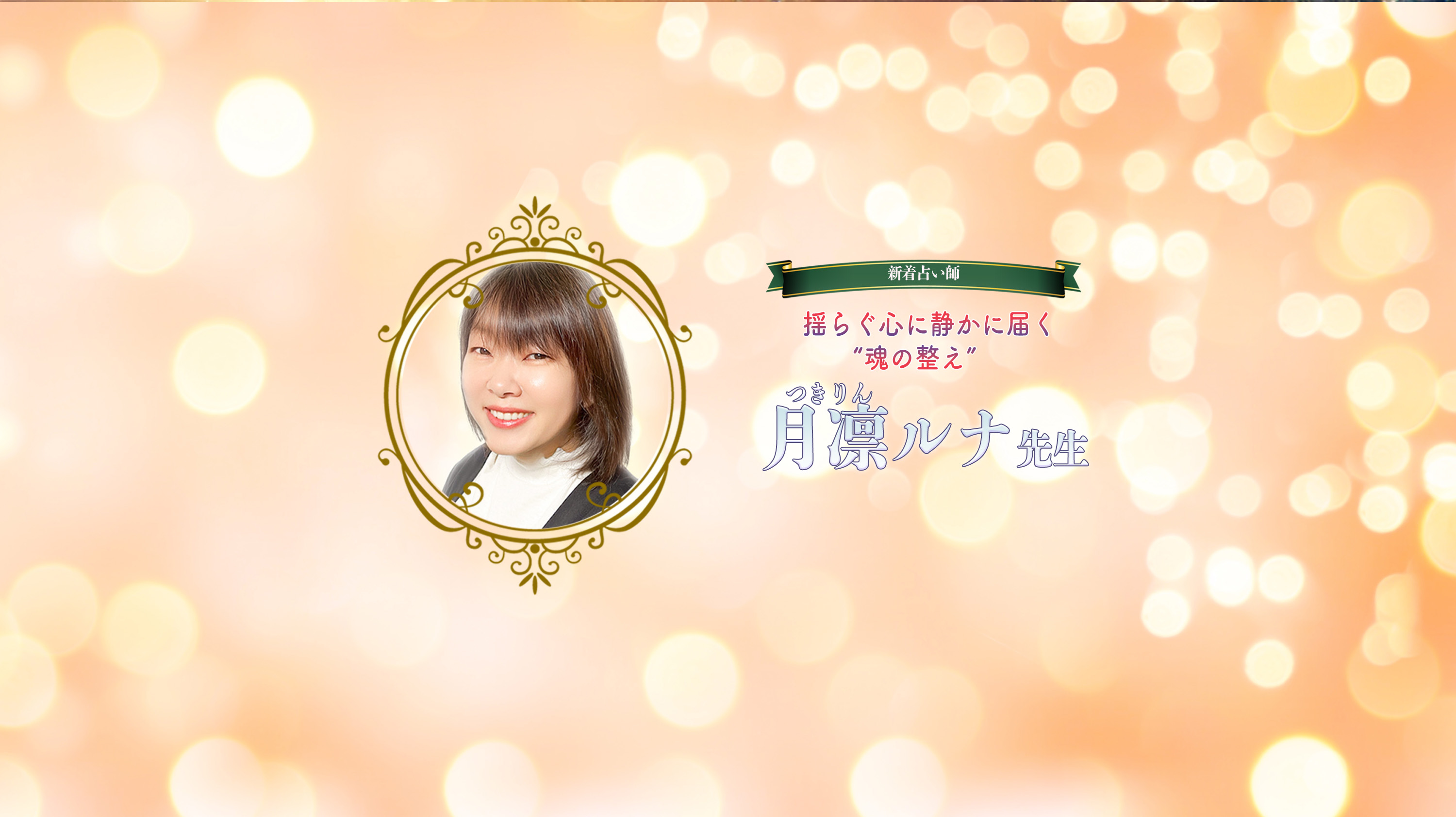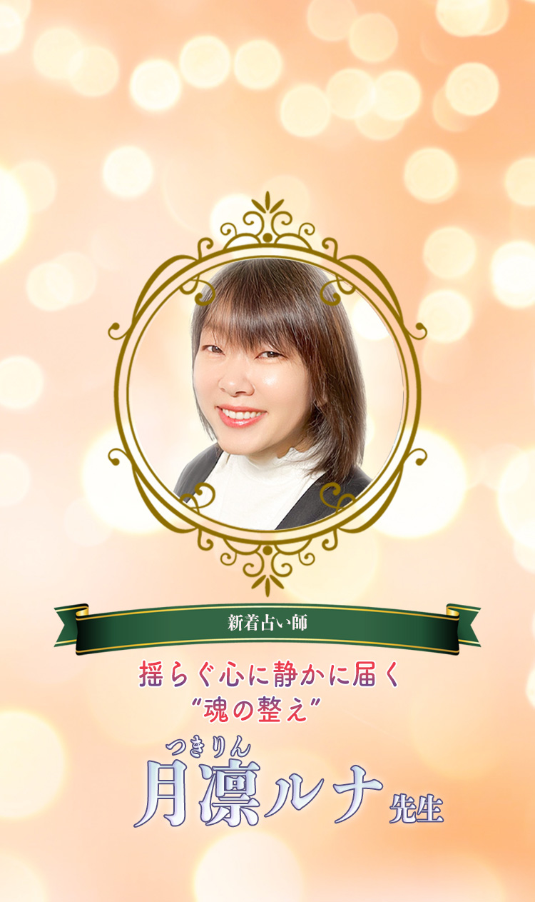 霊感タロットやチャネリング、波動調整・ヒーリングを通じて、相談者の内側に眠る本音や感情のゆらぎを丁寧に読み取る"月凛(つきりん)ルナ"先生。乱れたエネルギーを優しく整えながら、恋愛・人間関係・仕事など、日々の迷いや不安に寄り添い、魂の直感や宇宙の流れに沿った“進むべき方向”を穏やかに照らしてくれます。「気持ちが重い」「どうしたらいいか分からない」そんなときこそ、安心して心を預けられる存在です。